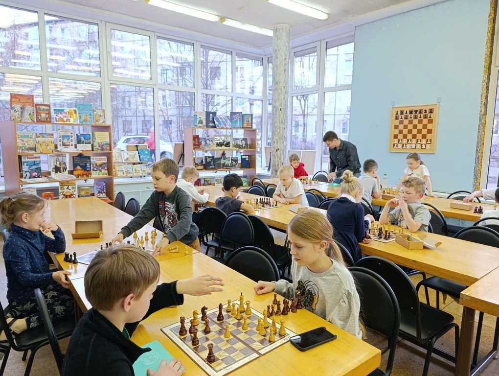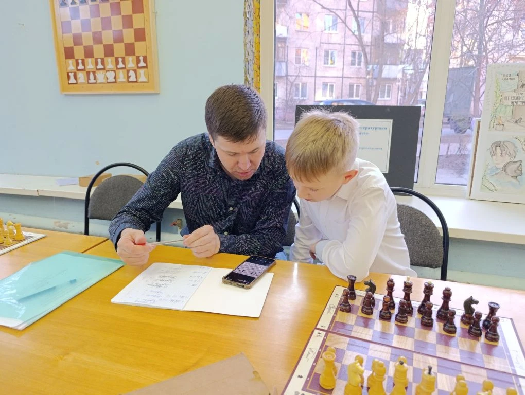 В библиотеке прошло очередное теоретическое занятие клуба любителей шахмат "Белая ладья". На этом занятии юные шахматисты тренировались, как ставится мат ладьей и королем в конце партии. После теоретической части ребята сыграли несколько шахматных партий друг с другом и отдали на проверку свои тетрадки с выполненным домашним заданием.