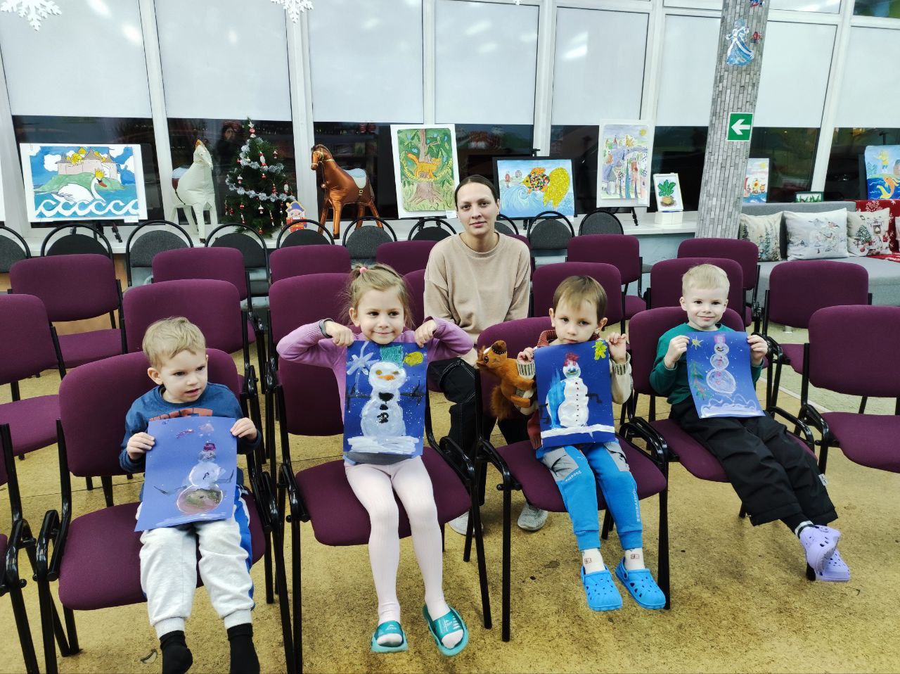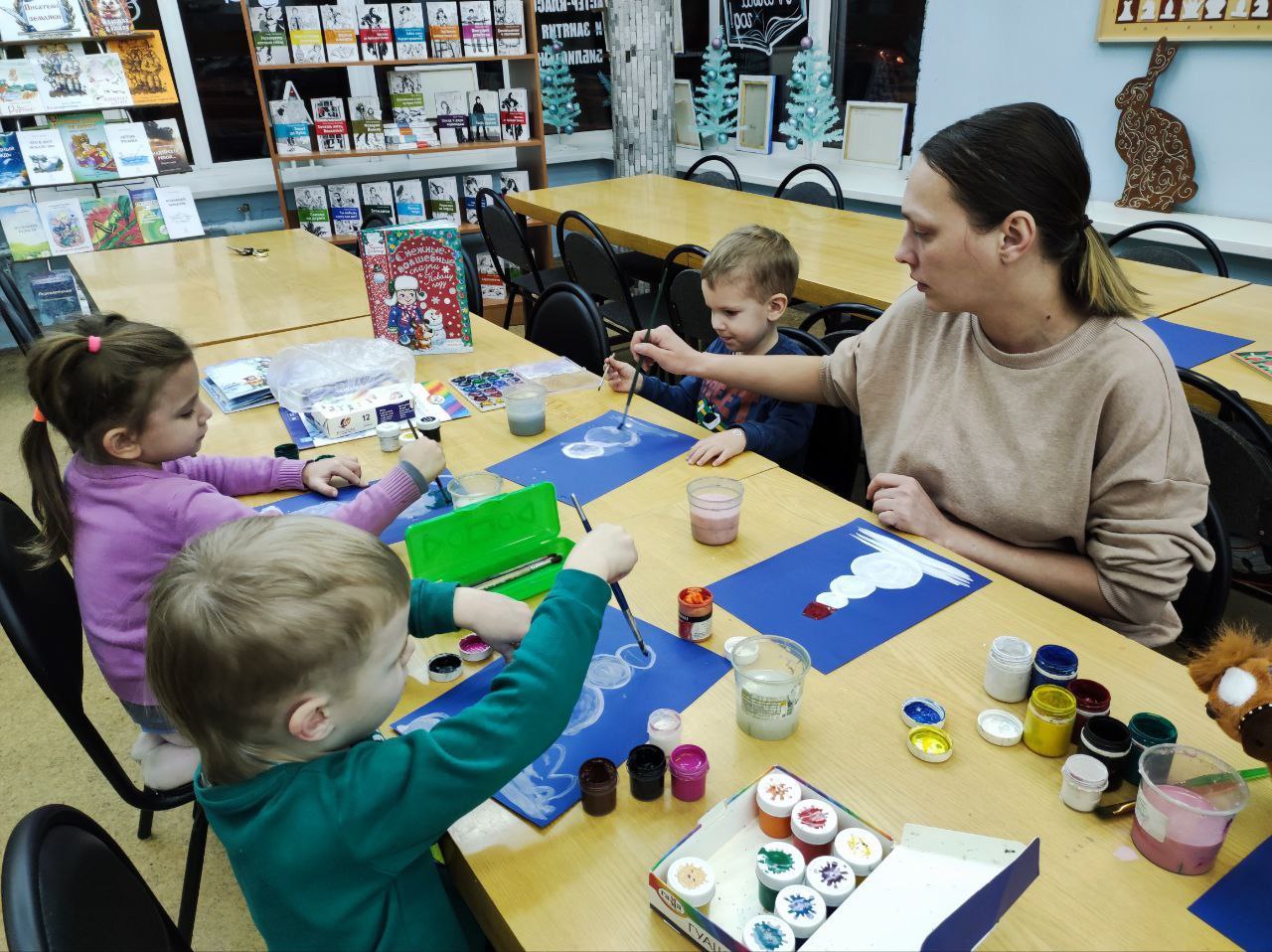 В библиотеке на кружке по рисованию с детьми 3 лет малыши создавали очаровательных снеговичков. Белая краска на цветном картоне ожила: морковные носики, шапочки, веточки, снежинки — каждый со своей фантазией. На занятиях маленькие посетители кружка развивают моторику, координацию и любовь к творчеству. У всех получились яркие, тёплые шедевры.