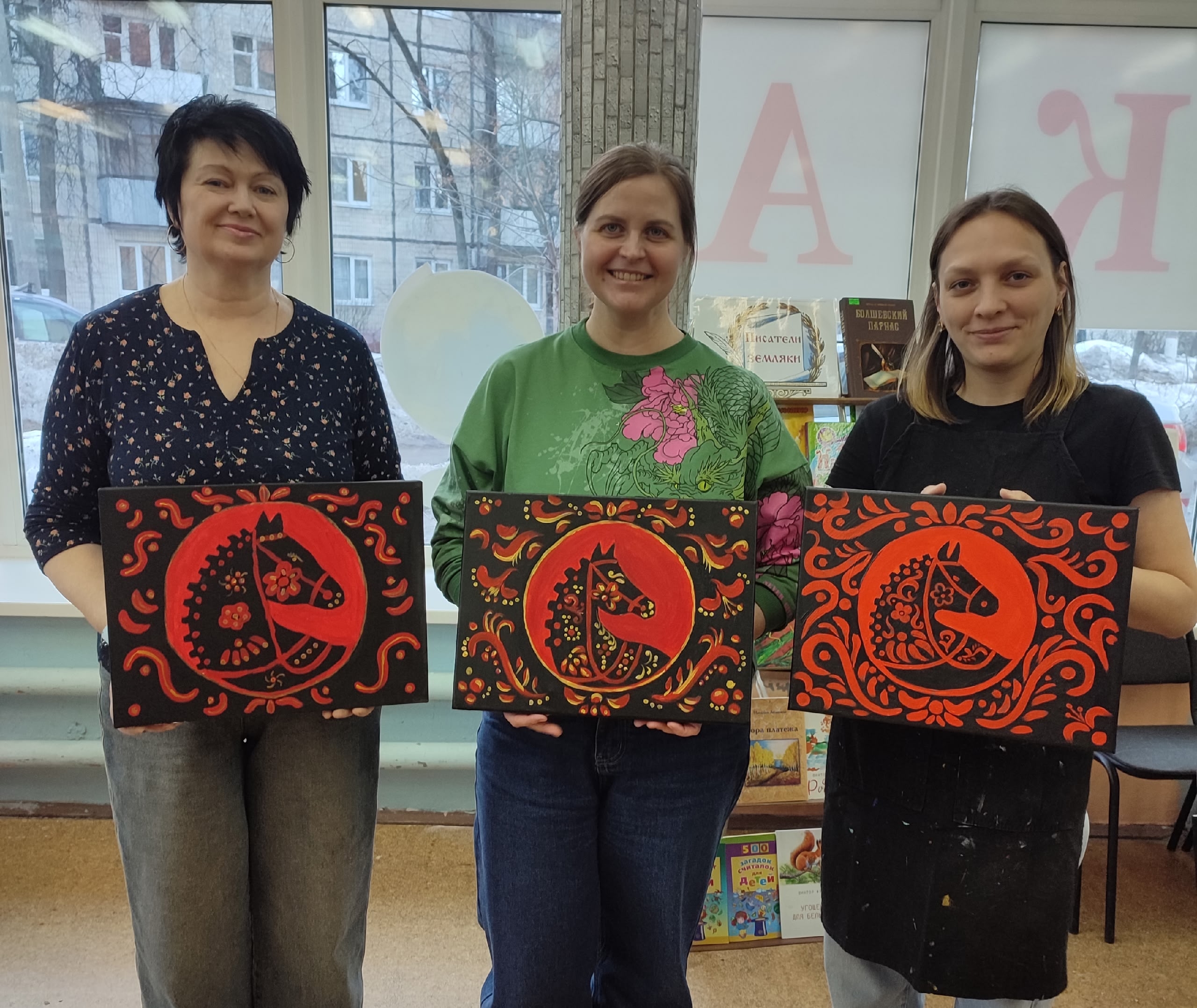 В библиотеке прошёл мастер-класс для мам наших читателей по рисованию интерьерной картины. В уютной, тихой атмосфере нашей библиотеки родители наших читателей погрузились в мир творчества, создавая силуэт коня, украшенный яркими узорами хохломы. Красный конь на чёрном фоне с красными и золотистыми завитками, цветами и ягодами получился по-настоящему живым и праздничным – классика русской росписи ожила под их кисточками! Это арт-терапия: релаксация, творческий полёт и радость от своего интерьерного шедевра.