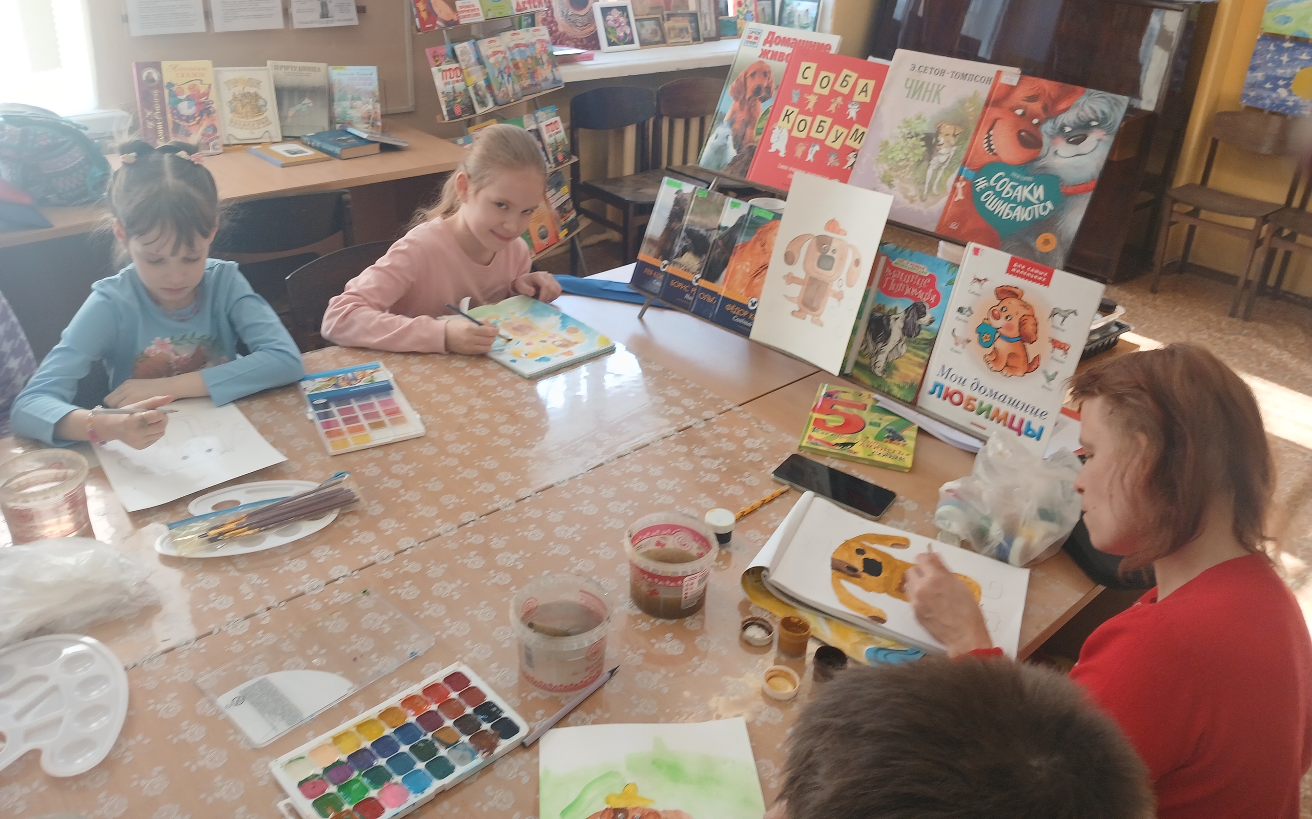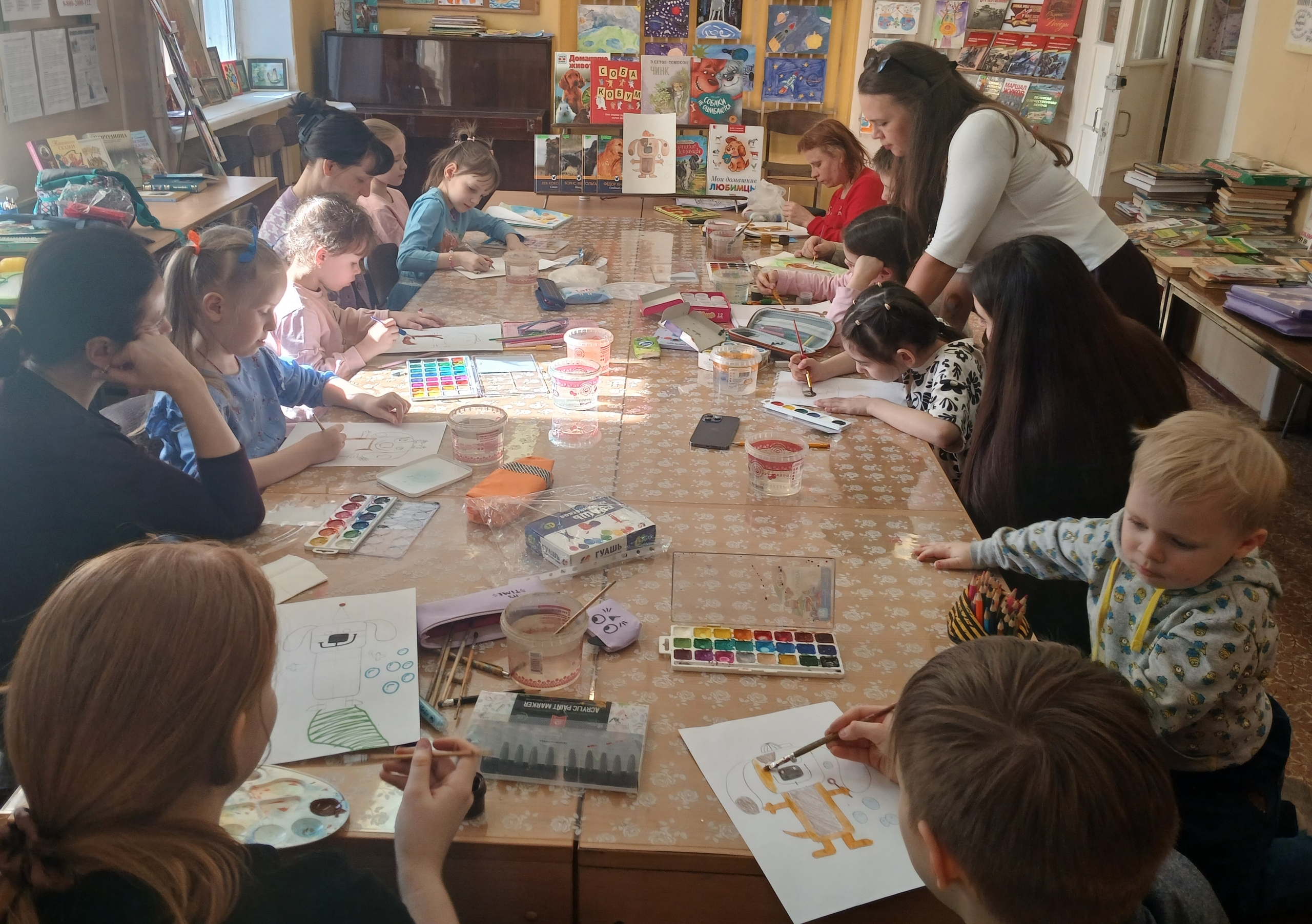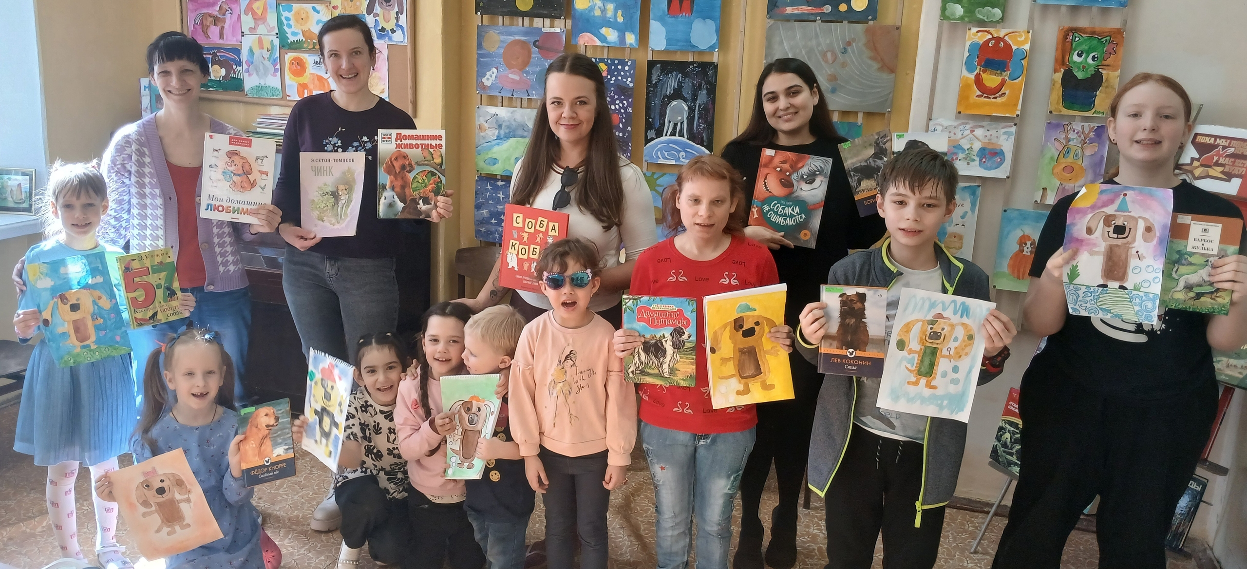Маленькие посетители библиотеки и их родители приняли участие в литературно-художественной композиции "Наши верные друзья". Ребята вместе с родителями вспомнили любимые сказки и литературные произведения, где главной героиней была собака. Сотрудник библиотеки прочитал посетителям мероприятия поучительный рассказ Сергея Георгиева "Собаки не ошибаются". Затем, в технике акварели, юные художники нарисовали иллюстрацию "Пёсик в шапочке".