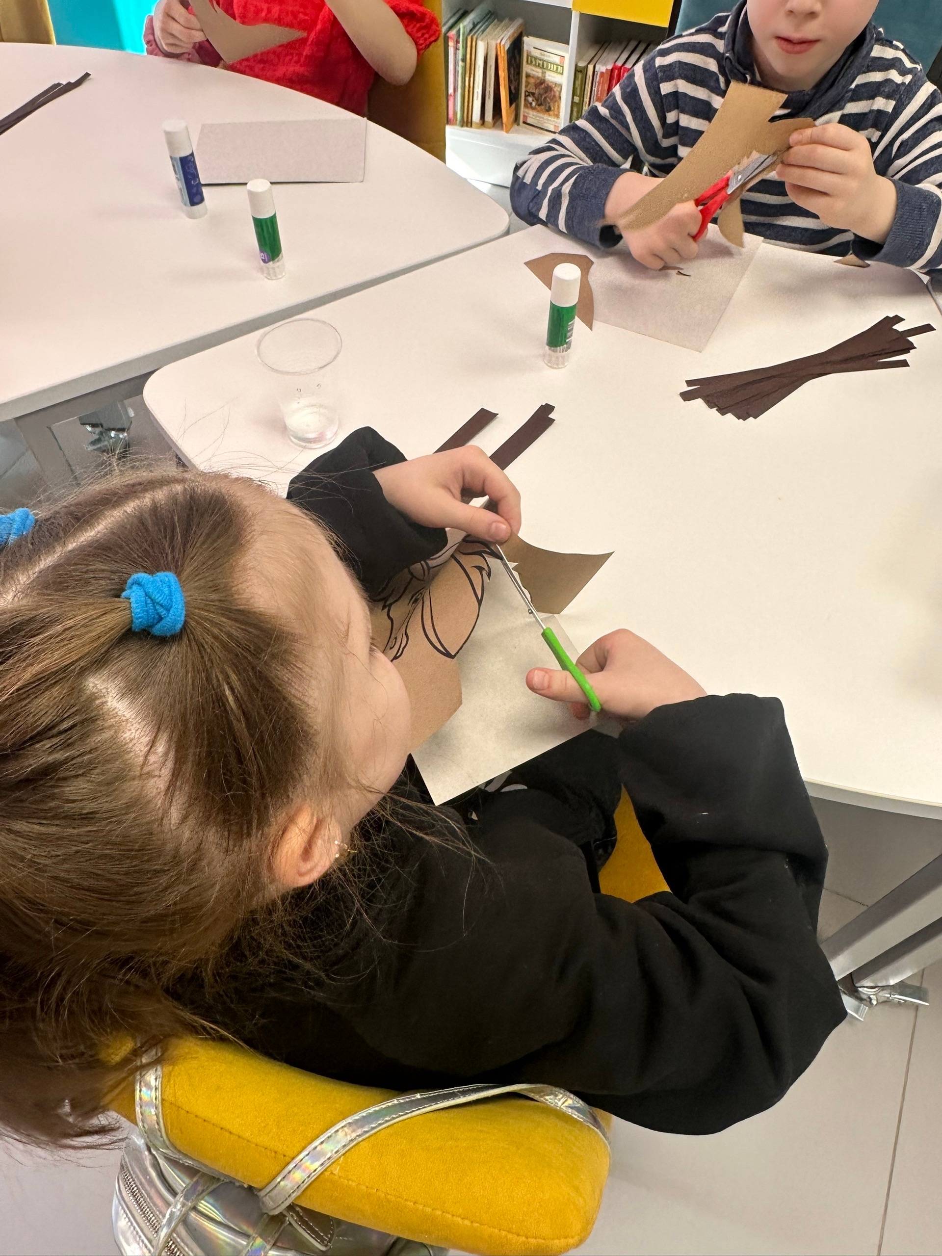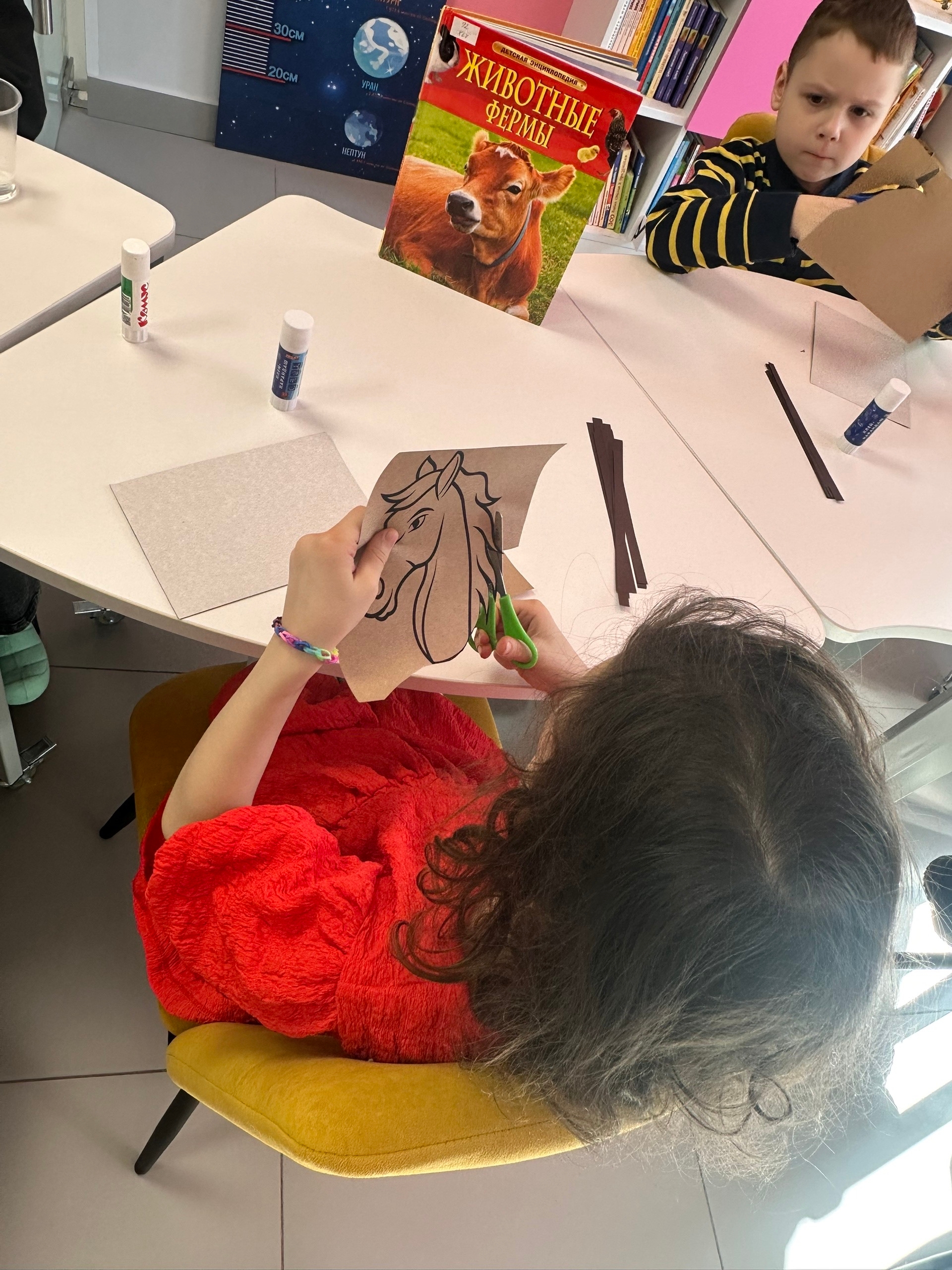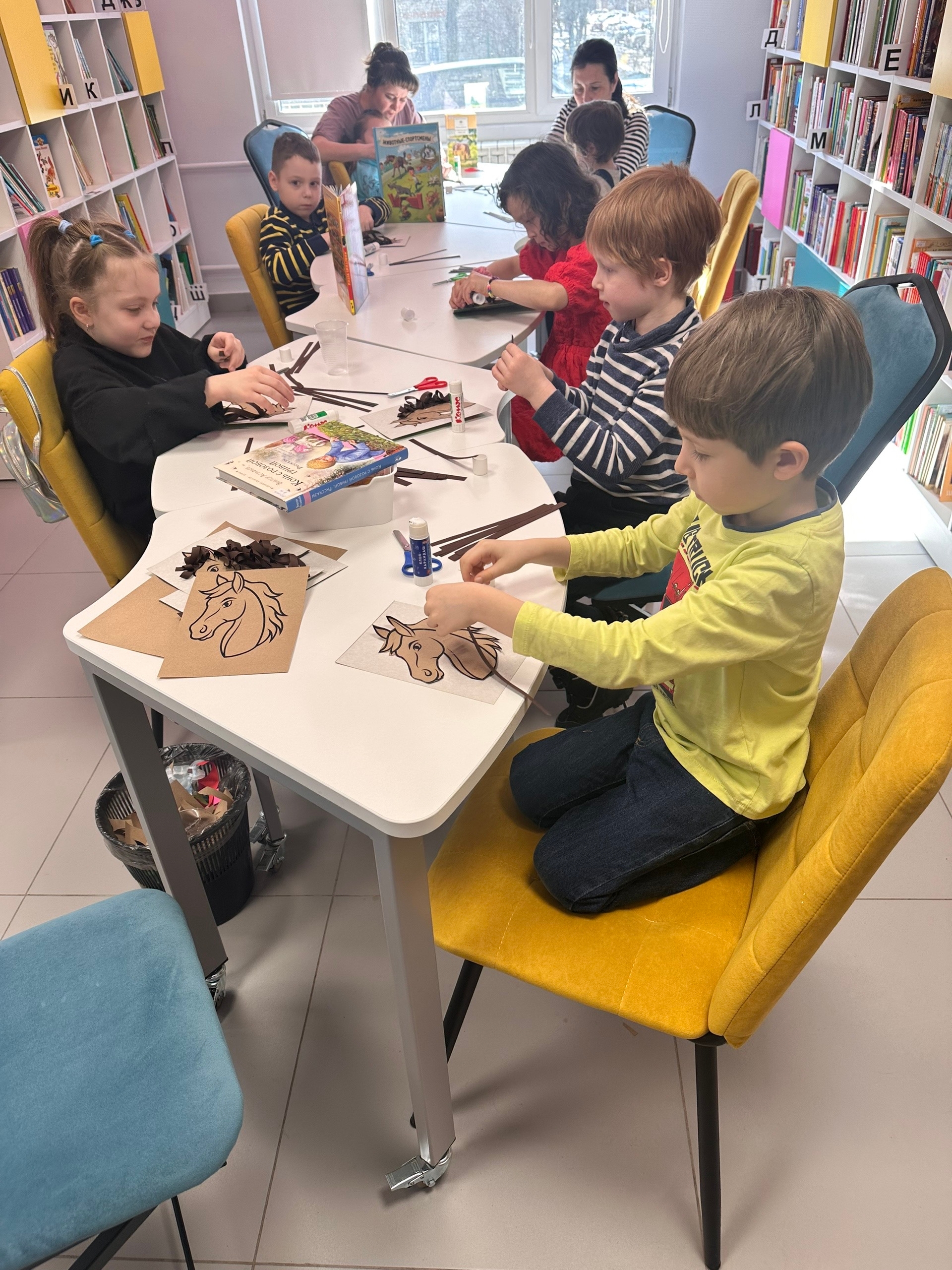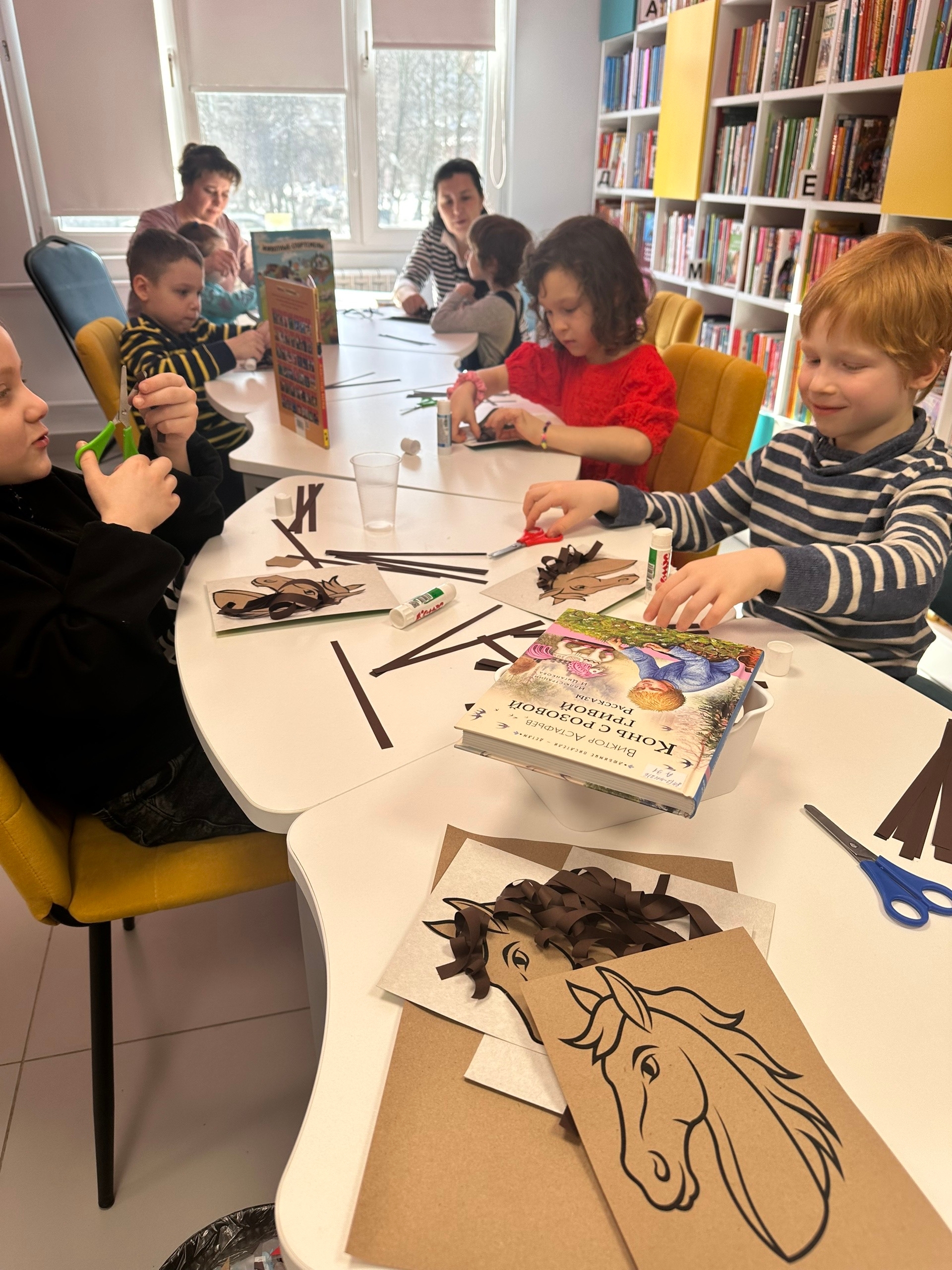Дети учились правильно вырезать основу лошадиной головы придавая ей аккуратность и симметрию. Затем использовали цветную бумагу коричневых оттенков, аккуратно склеивая слои между собой, чтобы придать гриве объём.